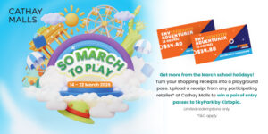 From 14 – 22 March 2026, get more from the March holidays and turn your receipts into a playground pass. Upload a receipt from any participating retailer* at Cathay Malls to win a pair of entry passes to SkyPark by Kiztopia.