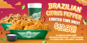 Brazilian Citrus Pepper Combo, $13.90 includes 7pc Boneless Wings (Brazilian Citrus Pepper + 1 other flavour), large Voodoo Fries, regular ranch and a regular drink.
