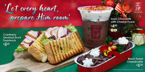 Celebrate the season with the delightful flavours of our Cranberry Smoked Duck Toastwich ($5.60), our iconic Ya Kun Toastwich with a festive twist, made with smoked duck, cranberry mayo and garlic toastwich; Iced Chocolate Cheese Foam ($4.80), topped with creamy cheese foam and festive crumbles; and Black Forest Cheesecake ($5.20), rich, decadent, and topped with a layer of chocolate sauce.